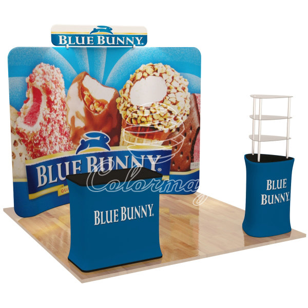 Item NO.CM-TF-812 Quantity Specification 1pc 8ft Curved Frame With Head 1pc Podium Counter With Printing 1pc Triangular Display Tower Option Spot Lights Display size 10ft Booth(3x3m) Packing size 56Wx103Hx39L Tension Fabric Display Stand